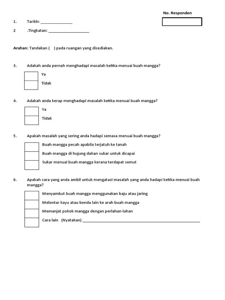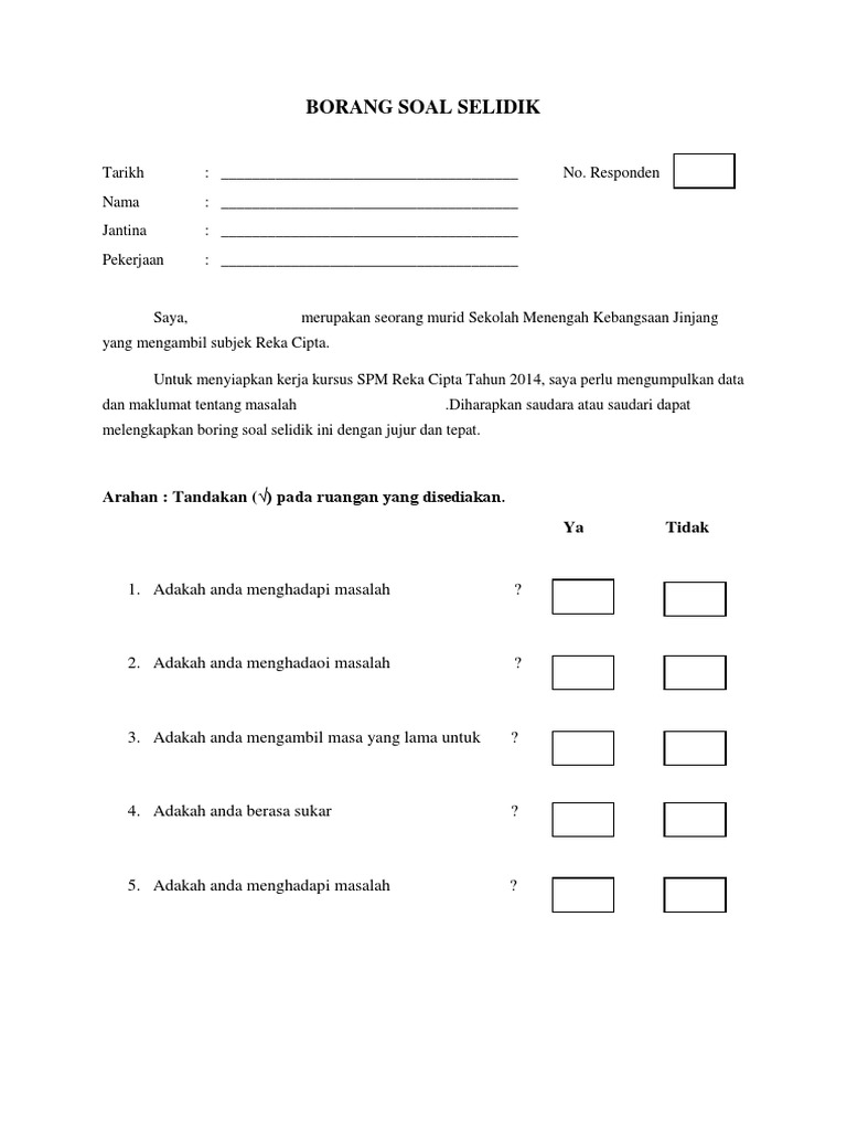 0 ratings0% found this document useful (0 votes). Ini bertujuan untuk mengkaji tentang sejauh manakah penerimaan orang melayu. Add to collection(s) add to saved. This questionnaire will be processed using icr technology (intelligent character recognition). Koperatif dalam pembelajaran dan pengajaran sains d. Lima orang pensyarah dari fakulti pengurusan dan pembangunan sumber. □ yes □ no □ very skilled □ skilled □ average □ low. Soal selidik ini adalah bagi memenuhi metalogi kajian kami bagi kursus hubungan etnik (ctu 555). Download borang soal selidik, we are a sharing community. Universiti teknologi malaysia borang pengesahan.borang soal selidik yang terbahagi kepada 3 bahagian. Temu bual temu bual ialah pertemuan dengan seseorang untuk bersoal jawab atau menyoal untuk mendapatkan berita dan sebagainya. Borang soal selidik akan diedarkan kepada 30 orang penduduk taman jaya padang temu, melaka. If you want to learn soal selidik in english, you will find the translation here, along with other translations from malay to english.