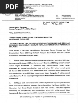 Menurut kenyataan kpm, pdp secara bersemuka di sekolah seluruh negara dibatalkan pada 20 januari 2021. 30 & 31 mei 2020 (dalam cuti pertengahan tahun). Analisa cuti perayaan utama 2019. Bagi tahun 2019 ini, kpm memperuntukkan tambahan cuti bagi tahun baru cina hari raya aidilfitri dan hari deepavali. Kalendar penggal persekolahan kumpulan a.