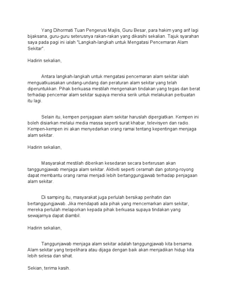 Top Pdf Langkah Mengatasi Pencemaran Sungai 123dok Com from data03.123doks.com Jika insiden ini dibiarkan, hidupan akuatik dan juga sumber air kita akan terancam dan menyebabkan kita kekurangan sumber tersebut. Apa yang dimaksudkan akan mendatangkan impak kepada alam sekitar? Apabila pihak berkuasa mula mengorak langkah yang jitu dalam menjaga kekayaan alam sekitar negara, media massa perlu memainkan peranan penting untuk menyampaikan mesej kepada setiap golongan masyarakat. See full list on ipendidikan.my Pendidikan alam sekitar merupakan salah satu kaedah yang dapat dilaksanakan untuk mengatasi masalah pencemaran tanah. Sebagai pihak berkuasa, anjakan paradigma perlu diambil bagi memastikan kemajuan masyarakat tempatan berlaku dari semasa ke semasa. Setiap bahan berpotensi untuk diproses semula menjadi barang yang berguna kepada masyarakat tanpa perlu membazirkan sumber yang baharu. Kesan daripada kecuaian manusia mengejar kekayaan tanpa memikirkan akibat terhadap alam sekitar telah menyebabkan insiden atau bencana berlaku yang mengancam nyawa manusia.